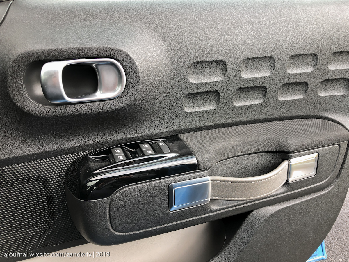 Ручка открывания передних дверей в виде ручки какого-то старинного чемодана. Хорошие на первый взгляд карманы в дверях. Туда должна влезть полуторалитровая бутылка лежа.