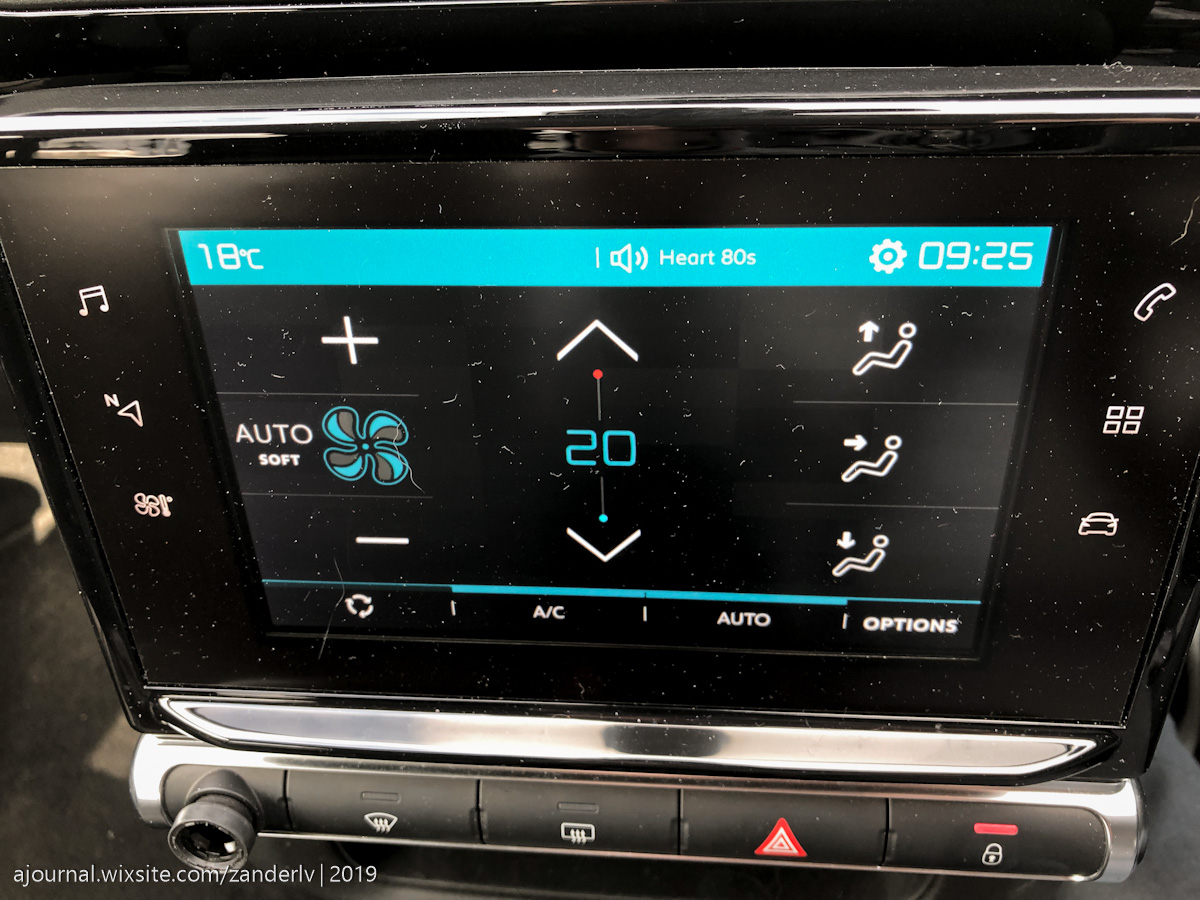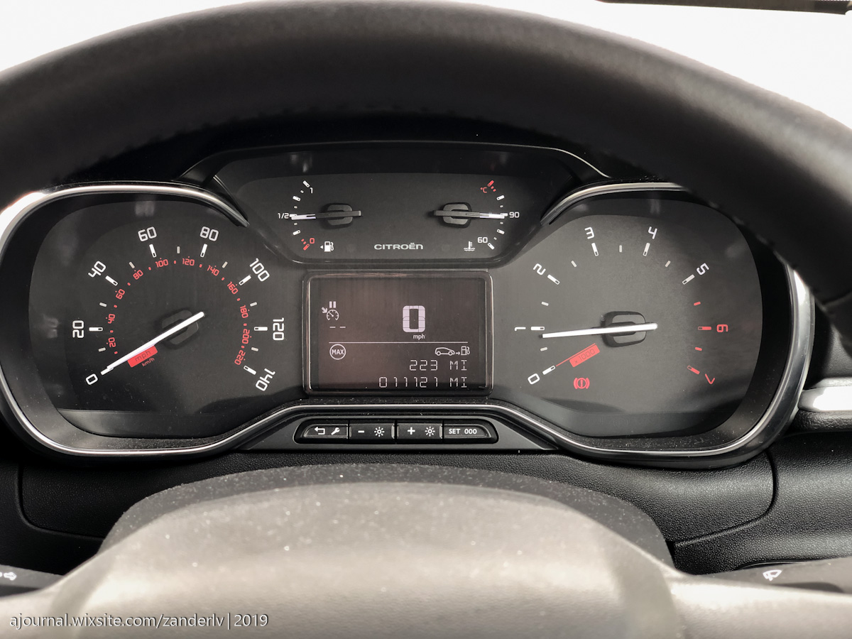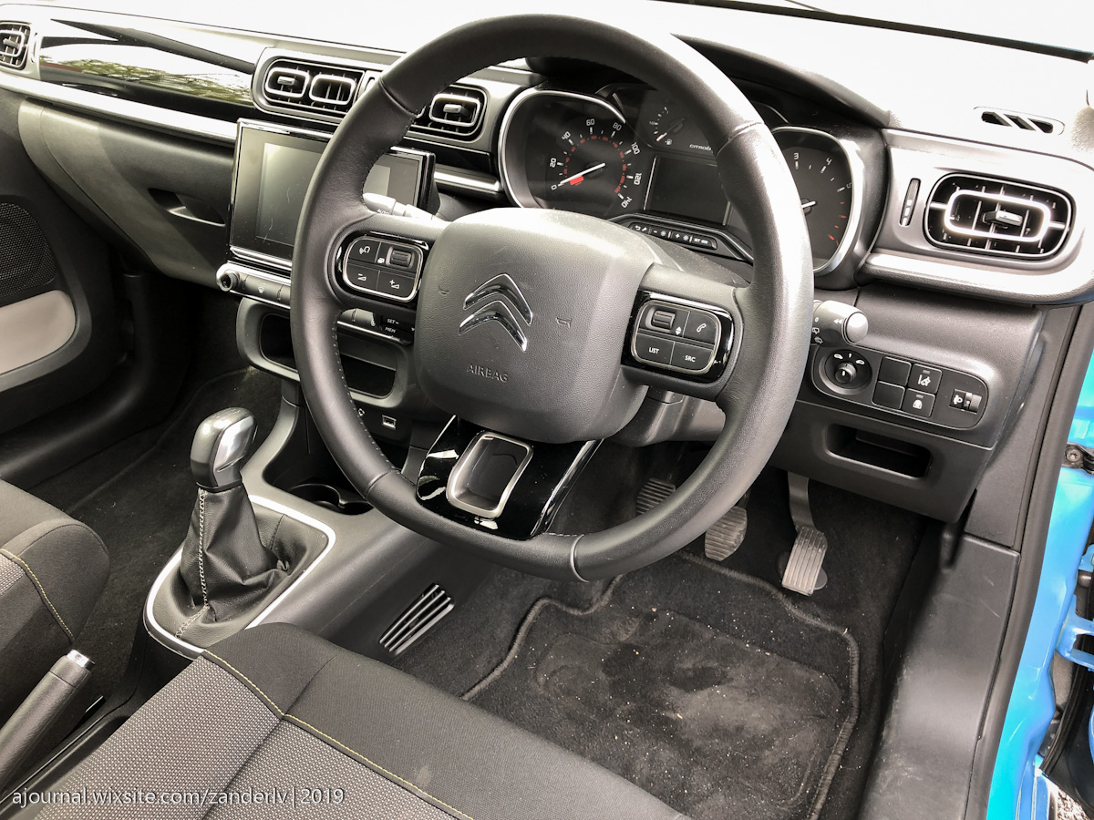 В Citroen C3 руль, в отличие от гигантского в C4, маленький и удобный. Скошенный снизу, это удобство. Я бы сказал, он даже очень удобен для машины такого класса, и регулируется по высоте и глубине. Еще бы круиз контроль был в нормальном месте и выполнен адекватно, цены бы не было, а был ведь ранее, в том же C4. Регулятор круиз контроля спрятан за рулем, как в Renault, и кнопочки на нём абсолютно неудобные, они работают но… они работают очень ненадежно, точнее, их нужно давить на себя, чтобы сделать скорость больше или меньше, причём сильно, чтобы это сработало. Никогда не знаешь, сработало нажатие или нет, нужно постоянно сверяться с информацией на бортовом компьютере.