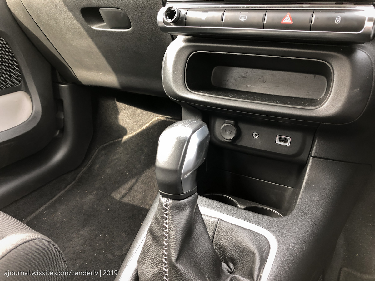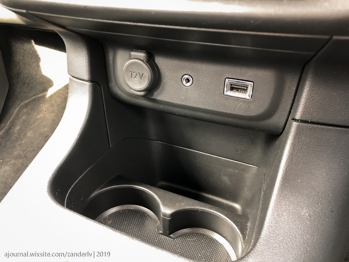 Есть прикуриватель, выход AUX, также USB и подстаканники – 2 спереди и 1 между сидений.