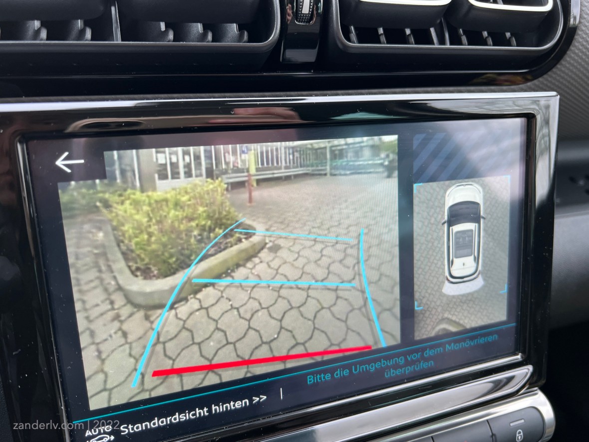 Разрешение камеры заднего вида ужасное, но это всегда лучше, чем ничего. Есть и направляющие контуры при повороте руля для камеры заднего вида. В этой машине нету дополнительных камер сбоку и спереди, поэтому 3D рисунок (вернее вид сверху) получается только при движении назад и в результате не очень точен.