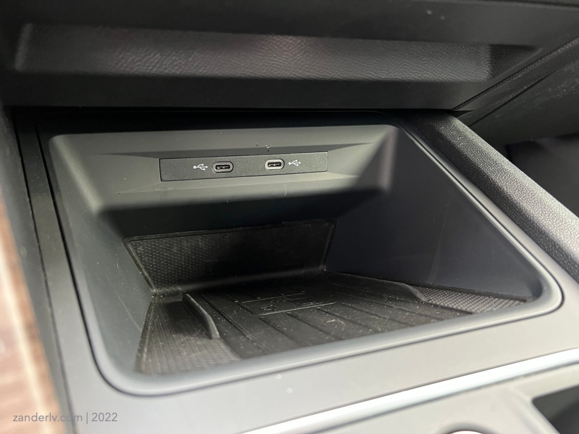 Есть два разъёма USB-С и прикуриватель в подлокотнике.