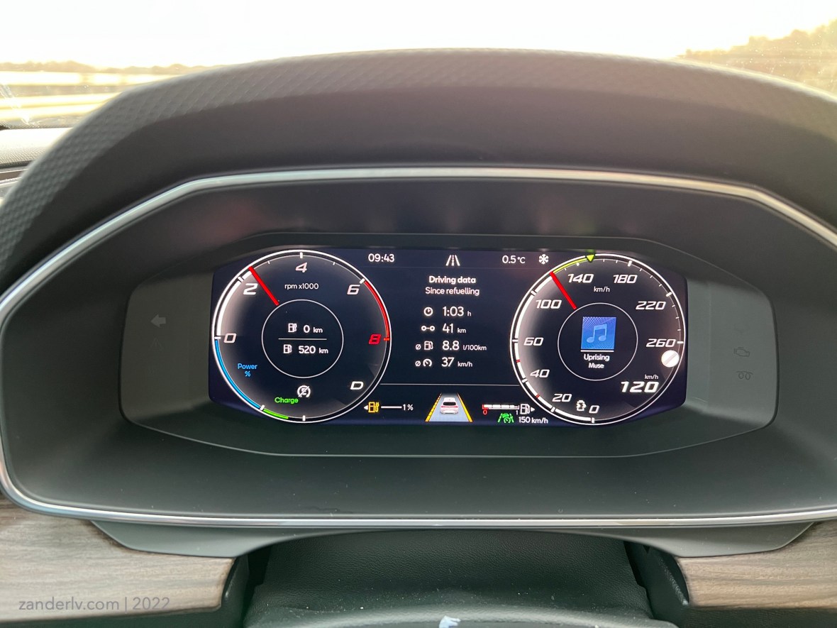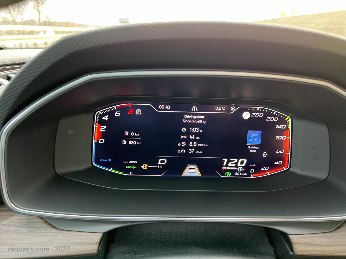 Панель приборов представляет собой настраиваемые дисплей, всё в принципе на своих местах, есть небольшой выбор – на свой вкус, как все должно выглядеть, но найти регулировку яркости главной панели я не нашел. Регулируется только мультимедия дисплей, а здесь остается ночью только выбрать экран, на котором есть лишь скорость, но даже при этом он остается довольно ярким в темноте.