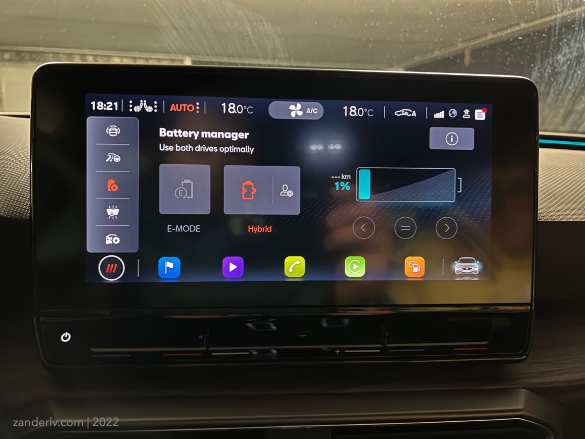 Это плагин гибрид, и поэтому он практически не заряжается от обычной езды без подключения к розетке. Проехав на нём около 300 км, заряд батареи был постоянно от одного до 2 %, чего хватало, чтобы не заводиться двигателю стоя на парковке, и также хватало, чтобы тронуться на электричестве.
